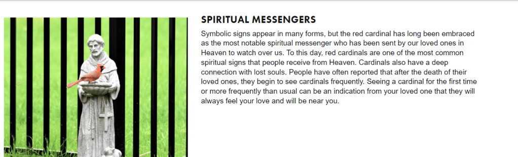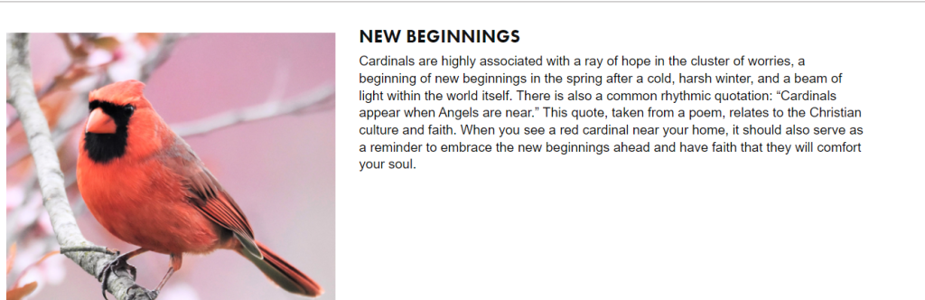 Red Cardinals are what I am seeing now. Several bright blazing red birds sitting at my window chirping. then yesterday the idea of them popped into my brain and as I looked up there was a sign in front of me that read “Red Cardinal Drive.”